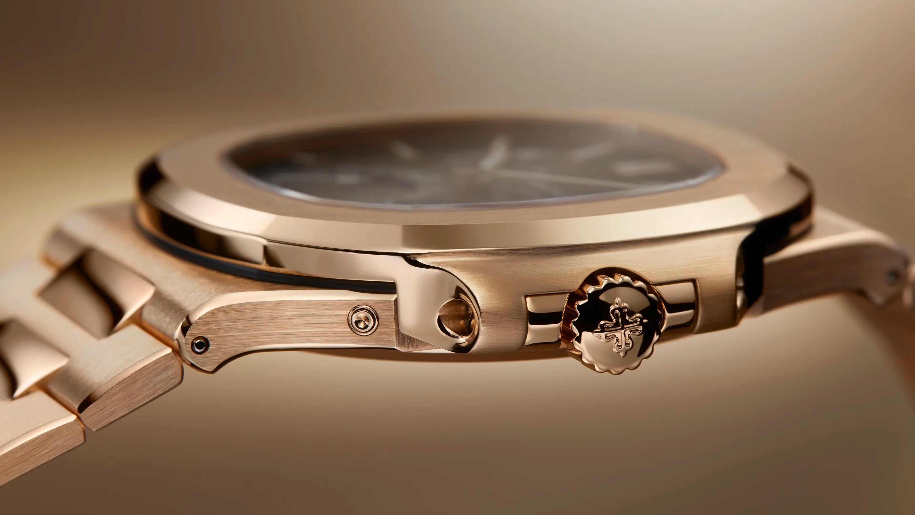 The ladies’ Nautilus with its small 32 mm case and diamond-set bezel comes in an original, refined rose gold version. The dial adorned with a dainty wave pattern features an elegant lacquered purple hue. This shade is echoed on the ultra-resistant composite strap with fabric pattern and Nautilus rose gold fold-over clasp.
